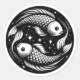A black and white celestial Pisces vector art with two fish swimming in a circle.