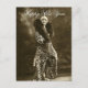 Vintage photograph of a young woman in a combination of hat and coat that are perfectly horrendous. The hat has a cap that fits the entire head with a stalk and a curving and dangling atrocity of a hat.. The coat is some kind of animal fur with fluffy black fur surrounding the collar. The bottom has an uneven edge which looks like it could be the untrimmed edge of the original animal fur