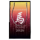 Celebrate the Chinese new year with this stylish commemorative gift bag, which features the Chinese letterform for the Horse, the seventh sign/animal in the Eastern zodiac, and traditional celebratory Chinese greetings, rendered on a gold-to-red gradient background. Reverse shows identical design.