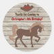 Personalised brown silhouette horse with a cowboy hat on a barn wood background western birthday party thank you stickers for boys. ~