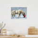 A beautiful image of a white horse and a girl in a red coat in a snowstorm. This would look beautiful on any wall.