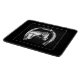 An image of a black and white scratchboard illustration of a Thoroughbred horse wearing a bridle with a shadow roll within a horseshoe. This drawing was etched in india ink on cardboard.
