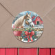 A pretty amber brown and white horse behind a rustic wood fence with a festive wreath on it. In the background is an old rustic red barn.