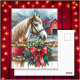 Personalised Christmas postcard. A pretty amber brown and white horse behind a rustic wood fence with a festive wreath on it. In the background is an old rustic red barn.