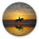 Pretty sunset colours reflected in the water, with a horse and rider silhouetted by the sun setting into the ocean. A pretty beach and horse scene.