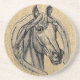 Vintage cameo style illustration of a horse with horseshoe frame. Burlap texture background