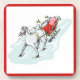 This design is a white horse pulling a red carriage through the white snow. Golden stars are placed around the carriage. Available with a red or green border. Available in assorted merchandise to match.