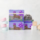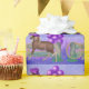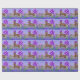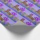 Horse with purple hat and purple balloons next to a fence with a lasso. Birthday or other occasion gift wrapping paper.