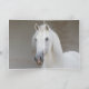 A gorgeous pure white Lusitano stallion tosses his head in an arena in Portugal. This is a Save Wild Horses Crad, images by Carol J. Walker.
