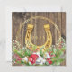 Personalised horse photo Christmas cards with your horse's photo in wood frame, gold elements, Christmas wreath and a gold horse shoe on the back with your text on both sides.