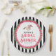 This Derby party plate has a watercolor race horse with a jockey in pink surrounded by a wreath of red roses with the saying "Bridal Shower" There is a black and white striped background. You can personalise with a name and date.