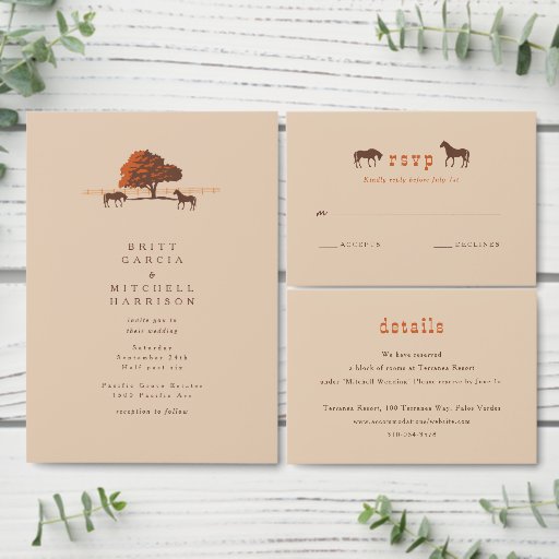 orange and brown colours with oak tree and horses on the back side, matching wedding suite