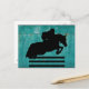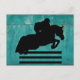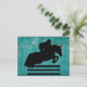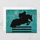 A horse and rider silhouette featuring an equestrian rider on a show jumper / hunter jumping over a fence Turquoise rusted metal background