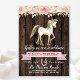Girls horse birthday party invitations with watercolor pony horse on a pink watercolor flower and rustic wood background. This horse any number birthday party invitation is easily customised for your event by simply adding your event details.