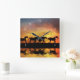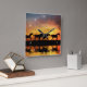 A herd of wild horses galloping through the sunset, their movements beautifully reflected in a tranquil pond. A stunning southwestern-style clock.