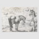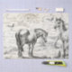 Vintage sketch of two horses in a grassy pasture with a fence and chickens with vintage French script and a French postcard "Carte Postale" and postmark on a parchment background. Great for decoupage and equine enthusiasts.