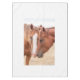 Two horses, a stallion and mare, stand side by side in an outdoor setting. The stallion is a liver, or sorrel, coloured mustang horse with a full, brown mane and a white snout. The mare is mostly white with a few brown patches and a shorter mane. The horses are standing on the ground, the stallion slightly ahead of the mare. The stallion looks forward, while the mare has her head turned to the side. The stallion's ears are perked up, while the mare's are slightly lowered. Both horses have their eyes open, looking into the distance.
