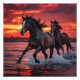 A breathtaking display of raw power and elegance—two mighty stallions charge through the water, their dark coats gleaming against a fiery sunset. The sky burns with passion, the water dances in their wake, and the spirit of the wild is unleashed in this electrifying moment. This is more than a photograph; it's a glimpse into the heart of the wild.