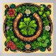 Horseshoe and clover for good luck, golden horseshoe surrounded by lush green clovers and colourful flowers. The central focus is a large green shamrock, with various floral designs encircling the horseshoe, creating a vibrant and lucky motif.