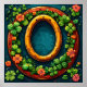 Horseshoe and clover golden oval frame adorned with vibrant flowers and lush green leaves. The background is dark, highlighting the colourful flora and giving a nature-inspired, whimsical feel to the composition.