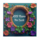Vibrant flowers and green leaves, set against a teal background. The frame features a wooden texture, while the floral arrangement includes a variety of colours such as orange, pink, purple, and green, creating a lively and artistic composition.