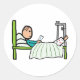 Hospital Bed design shows stickman reading a card while lying in bed. Has a broken leg in a signed cast raised by special equipment. Patient has comfy pillows and a relaxed resigned attitude to a hospital stay. Get well soon!