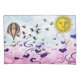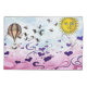 A vintage hot air balloon floats over a sea of love with hearts rising up into the air, past a flock of birds, towards a vintage sun.