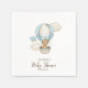 Cute baby shower invitation features hot air balloon with teddy bear, bird, and clouds.