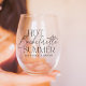 Get the party started at your summery bachelorette getaway with these stemless glasses featuring "hot bachelorette summer" in trendy typography with a line of custom text beneath; shown with the destination and year.