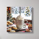 Beautiful seasonal Christmas wall art with an illustration of hot chocolate, sugar cookies, dried orange slices, cinnamon sticks and a Christmas tree outside a winter window.