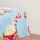 Hot Chocolate Christmas tablecloth, colourful and fun, features a starry blue background with red, green, and blue mugs of hot chocolate with candy canes and marshmallows. The mugs have eindeer, snowmen, Santa, and penguins!