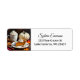 Pretty Fall themed return address labels. An ai illustration of a yummy Autumn scene with a piece of pumpkin pie and whipped cream on a fancy vintage plate, a mug of hot cocoa with whipped cream and a white pumpkin surrounded by cinnamon sticks and dried orange slices.