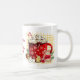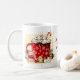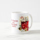 This is a festive winter Christmas mug featuring a mug of hot chocolate and some sweet Christmas treats on a green crosshatch background with the words "Hot chocolate and sweet treats weather". The text on the mug is customisable with your own or you can leave it as is.