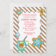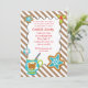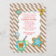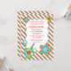 Cookies anyone? Nothing says the holidays more than a good old fashioned cookie exchange! Invite your family and friends over for some baked goods with this adorable cookie swap invitation. It's set on a light brown and white diagonal striped background. There's a white curvy tag in the centre. On the bottom left corner there's a blue with green mug of hot chocolate with a teddy bear's face on the front. There's marshmallows and a striped straw coming out of it. There's a blue iced star shaped cookie next to it. Use the back of this cute invitation to explain how a cookie swap works. Check out the many other designs we have.