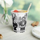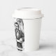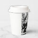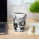 This is a hot coffee cup with lid with a whimsical design.