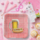 Hot dog and beer mug on a white and red gingham background.