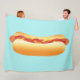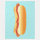 This blanket features a delicious cartoon illustration of a hot dog snack. The hot dog has a tasty looking bun and there are both ketchup and mustard on top of the sausage.