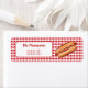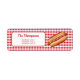 Destei's fast food illustration of a hot dog bun with a grilled sausage that has some ketchup and mustard on top. The background has a red and white colour gingham pattern. There are also two personalizable text areas.