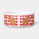 Destei's fast food illustrations of hot dog buns with grilled sausages that have some ketchup and mustard on top. The background has a red and white colour gingham pattern. The top and bottom have red thin border lines. There is also a personalizable text area for a name or other custom text.