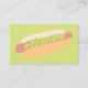 Create a handy hours of operation card for your hot dog stand or other business with this easy to customise business card. The front of the card features a vertical layout with a hot dog illustration and your own custom text. The back of the card features a larger illustration of a hot dog against a lime green background.