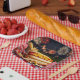 A hot dog with the word "AMERICA" written in mustard is placed on a patriotic plate with French fries against a backdrop of vibrant fireworks