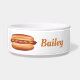 Destei's fast food illustration of a hot dog bun with a grilled sausage that has some ketchup and mustard on top. Next to the hot dog design there is a personalizable text area for a name or other custom text such as "Dinner", "Food" or "Water", for example.