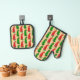 Hot peppers cartoon characters in red and green. Original design. Cute oven mitts and pot holders with plaid pattern background.