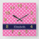 Hot Pink #2 Wht Polka Dots Navy Blue Name Monogram Square Wall Clock
