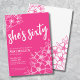Chic Sixty Hot Pink 60th Birthday Party Invitation. A fun but elegant 60th birthday party invitation with girly bright pink and white flowers for the young at heart. A playful flower pattern frames a script typography "she's sixty" mixed with a more classic serif font. Celebrate sixty years of life with this beautiful botanical design. The fun part is you can change out ALL of the colours!! You can not only change the background colours and font, but you can change the lines for the flowers as well.