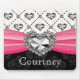 Personalise this pretty hot pink and black damask mouse pad with a fuchsia satin ribbon and rhinestone heart design with your name. A diamond heart and solitaire design on top of subtle striping make up the top of this design. Artwork and design © Chrissy H. Studios, LLC. All rights reserved.