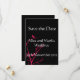 This hot pink and black save the date card really pops with the pink butterflies and branches with little buds against the dark black background.
