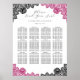 Hot pink and black wedding seating chart for 12 tables featuring elegant floral lace.