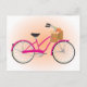 A fun hot pink bicycle with a basket filled with fresh oranges!
