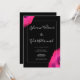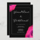 A wedding invitation with a pink, black, and white colour scheme. The design includes abstract, pink corners and white text. The names are written in a script font. This design has a sense of openness to it and a modern look.